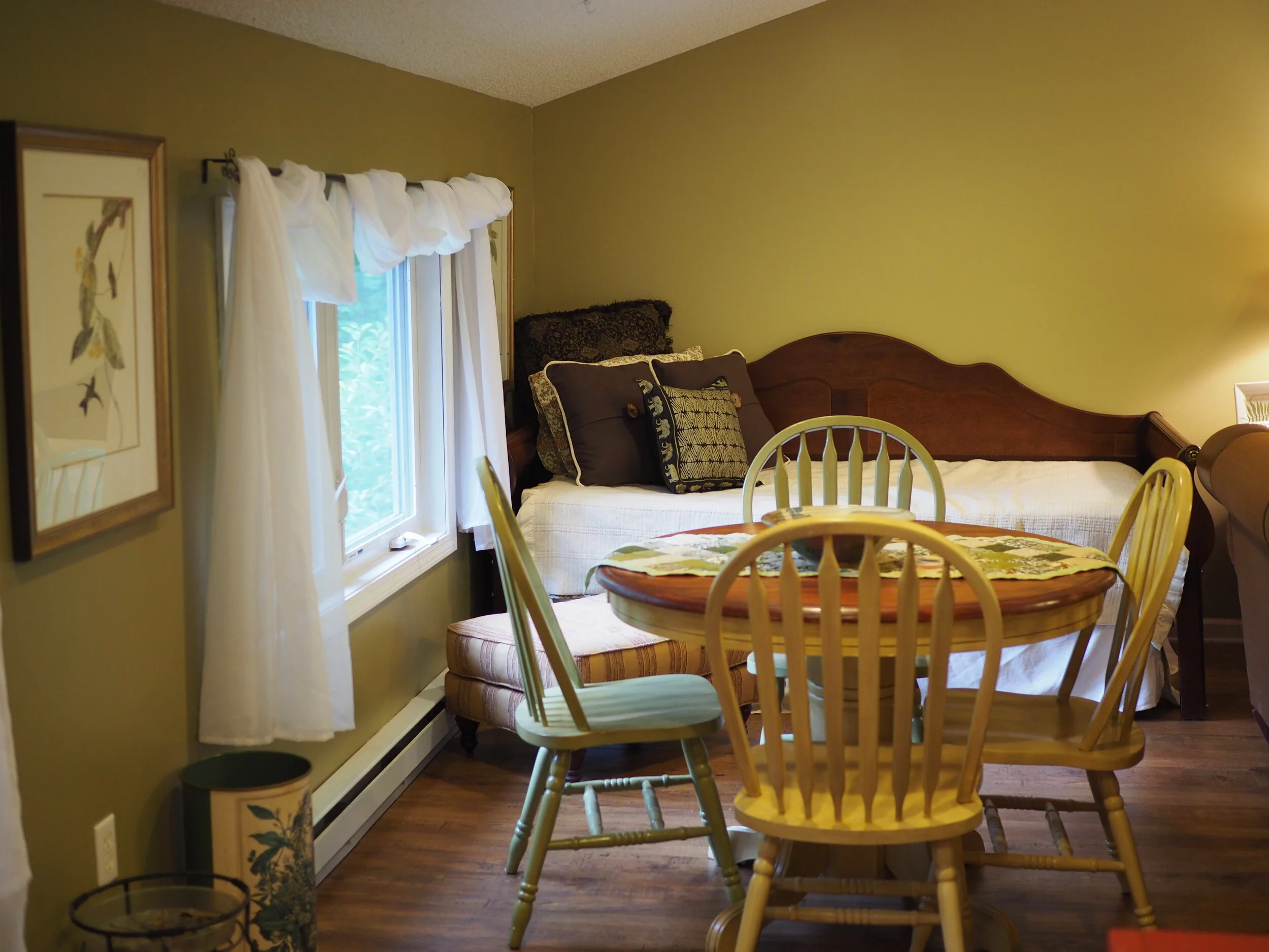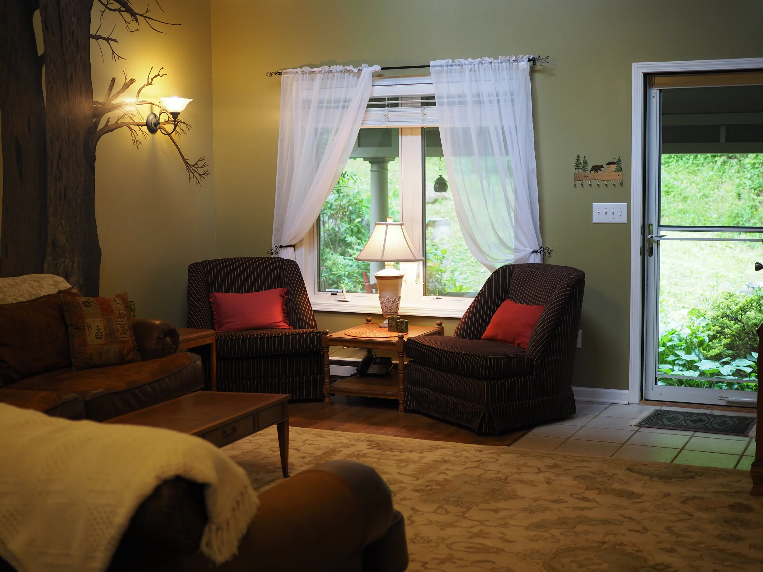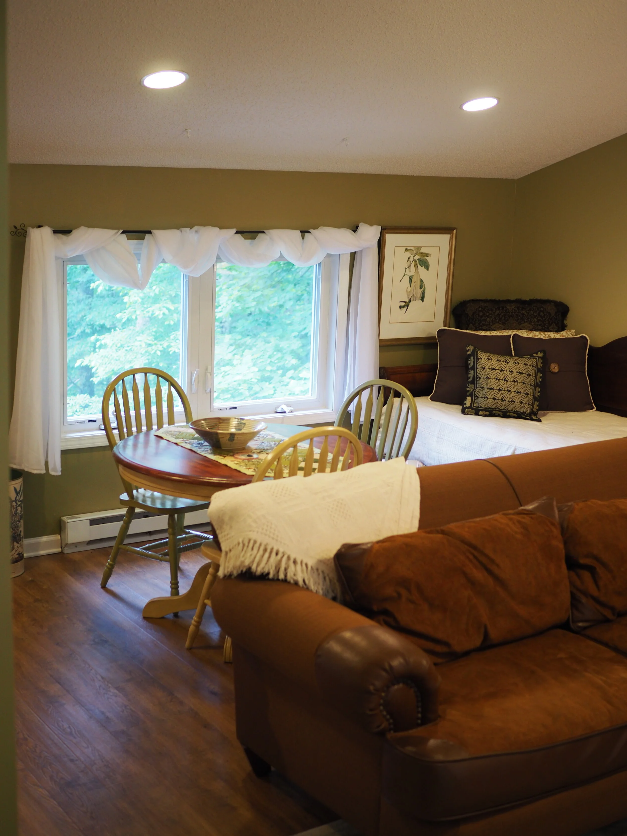 This lovely first floor studio, off of the main house, has beautiful windows looking out on the natural forests and gardens. The surrounding woodlands offer peace and quiet and you will appreciate the space designed for your comfort. The 25-foot tall main wall displays a large brown tree. Wifi and printers are available, as are folding tables for those who choose to use their time here for arts, crafts, music, and writing. The Big Tree Studio is not wheel-chair accessible. View our House Guidelines for more information.