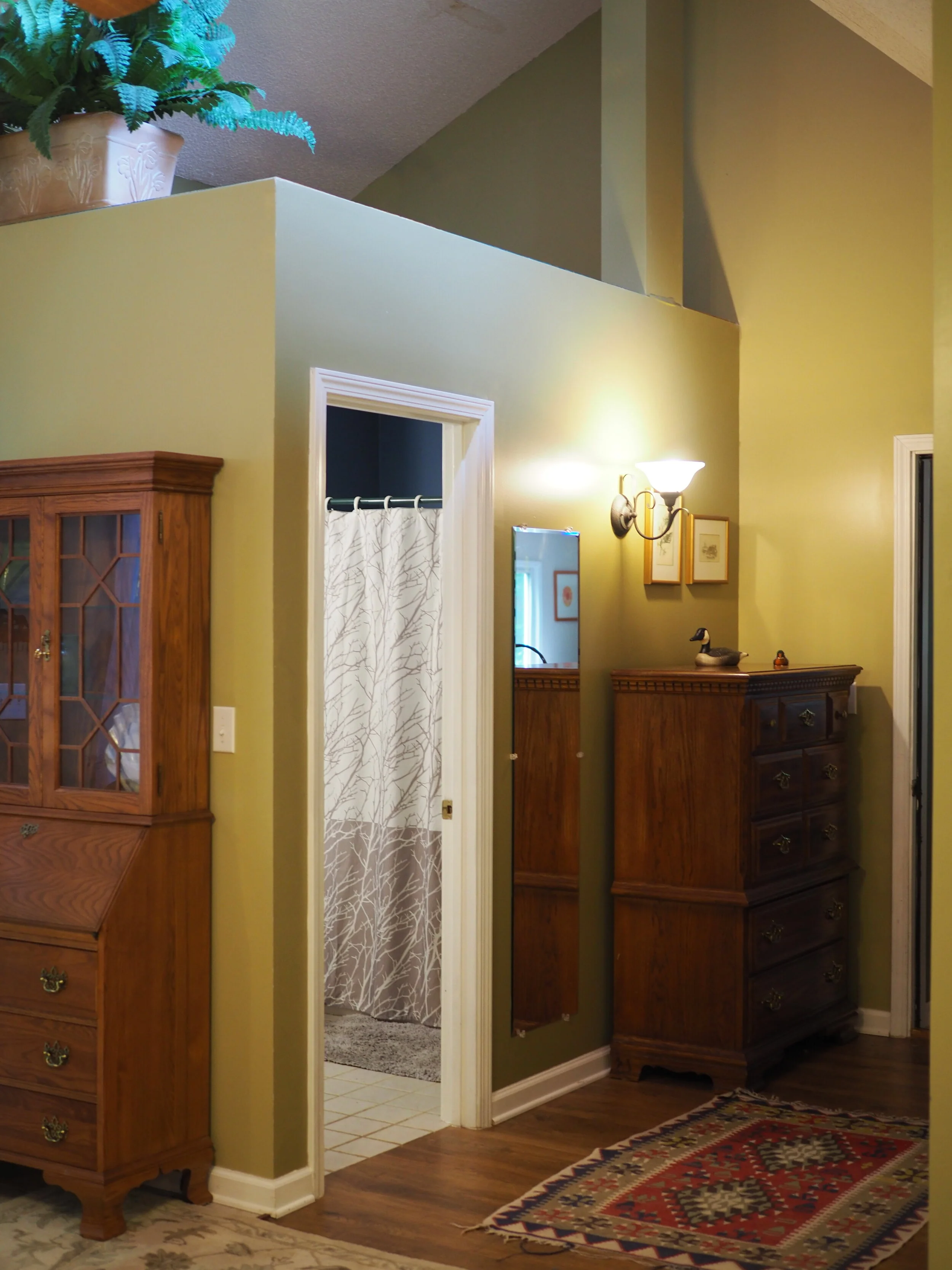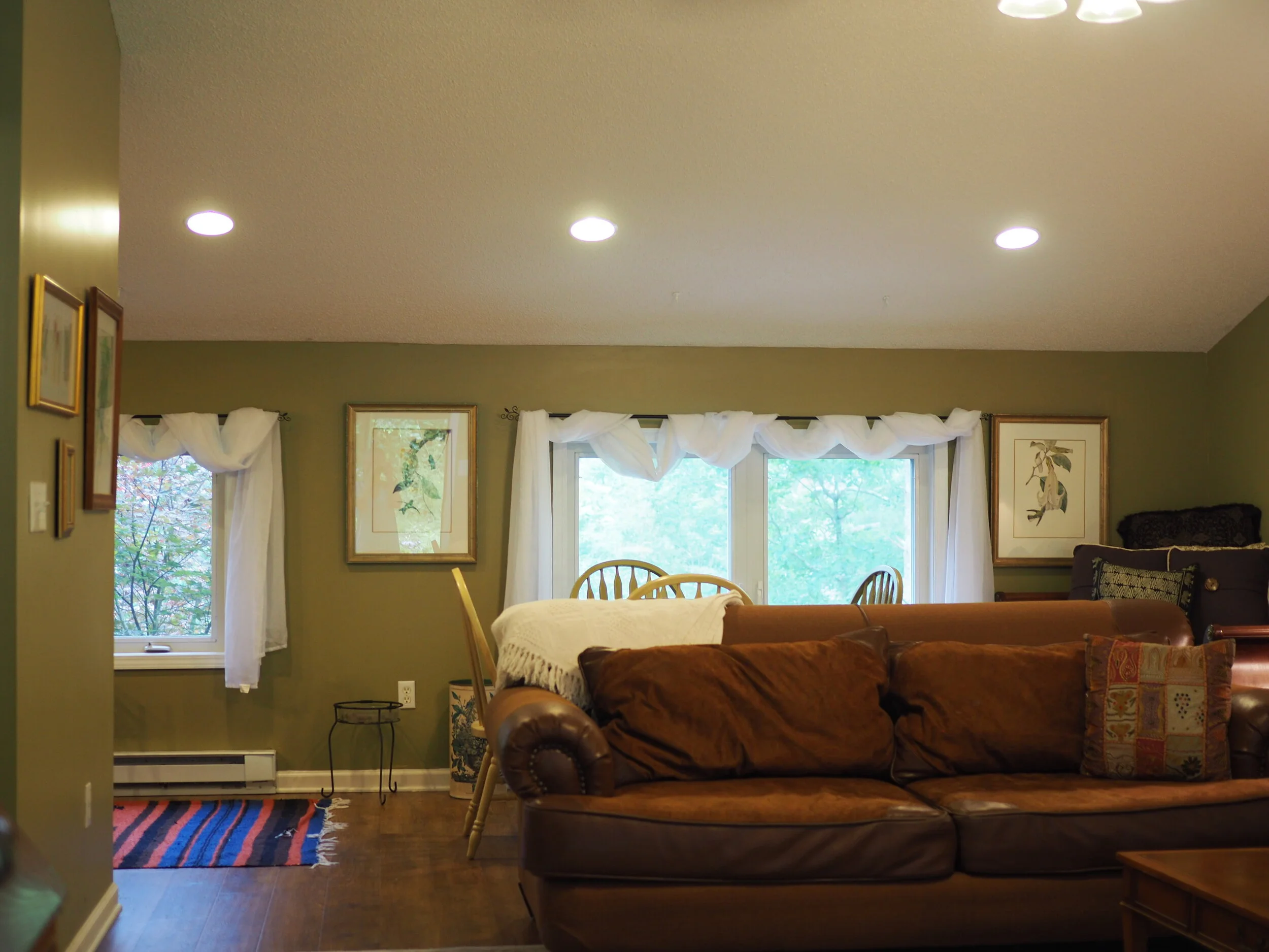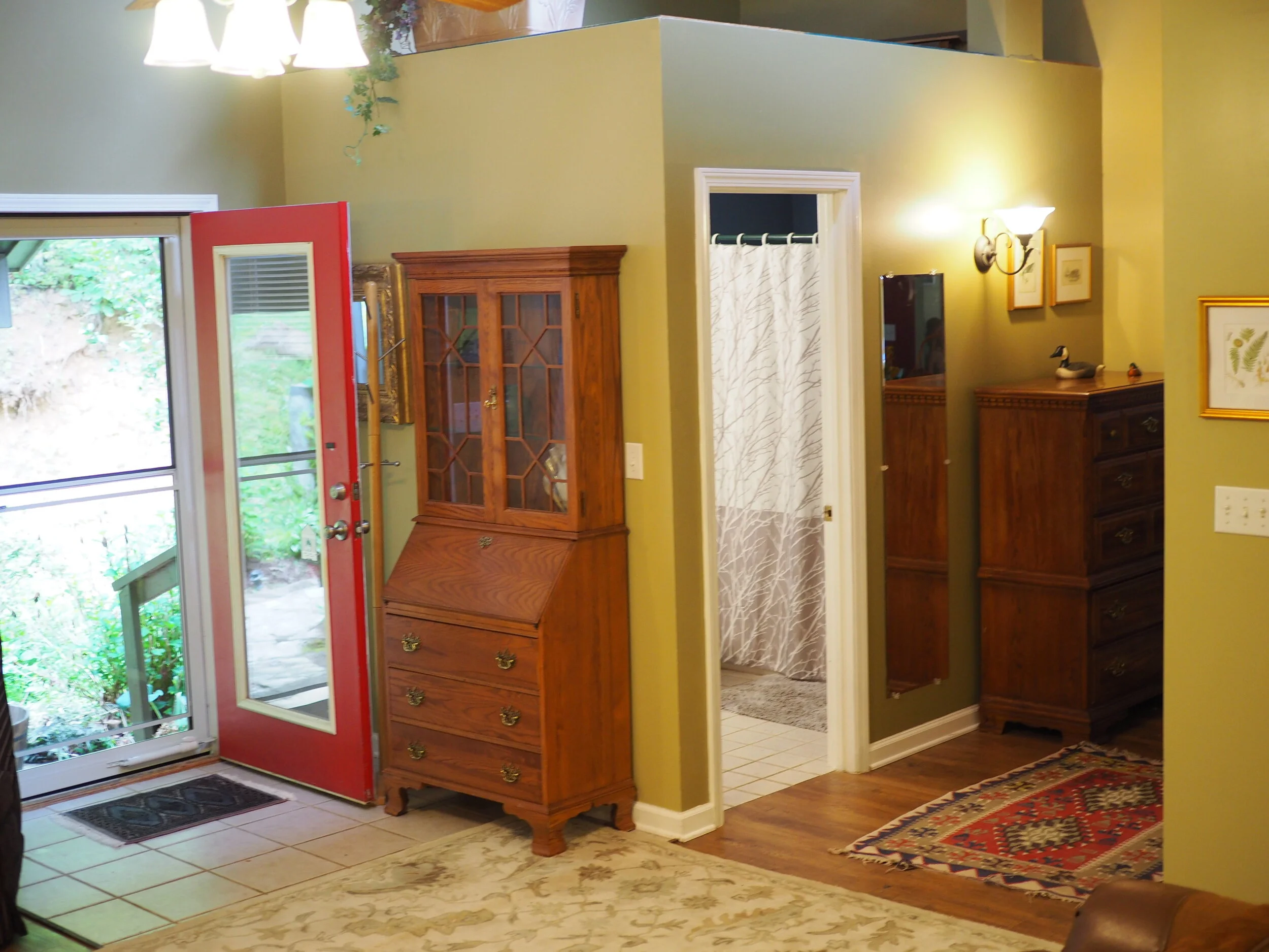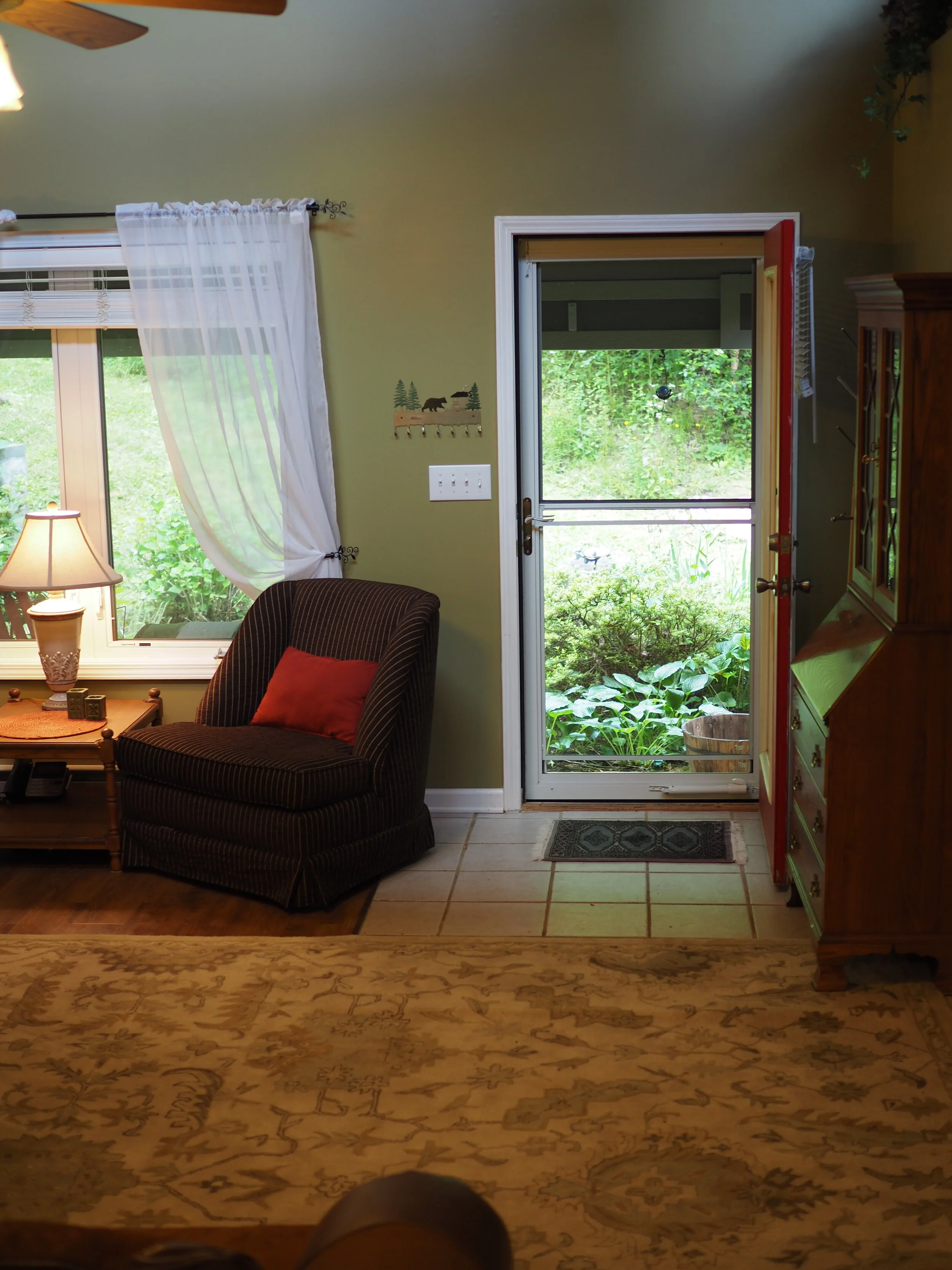 This lovely first floor studio, off of the main house, has beautiful windows looking out on the natural forests and gardens. The surrounding woodlands offer peace and quiet and you will appreciate the space designed for your comfort. The 25-foot tall main wall displays a large brown tree. Wifi and printers are available, as are folding tables for those who choose to use their time here for arts, crafts, music, and writing. The Big Tree Studio is not wheel-chair accessible. View our House Guidelines for more information.
