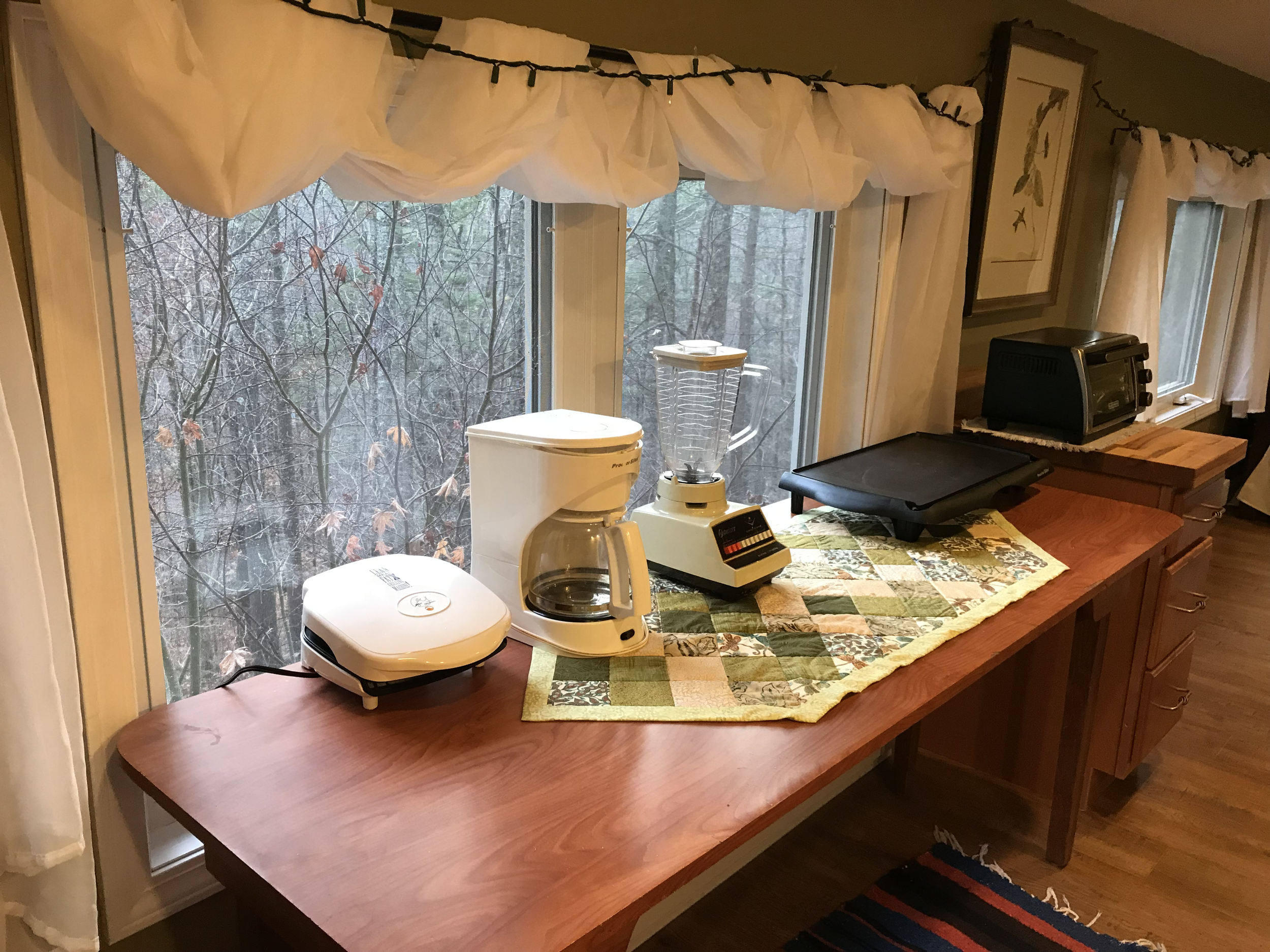 In an attempt to make your stay as easy and accommodating as possible the Big Tree Studio comes equipped with: Microwave, coffee pot, toaster oven, panini press, blender, electric griddle, pots/pans, dishware, utensils, spices, towels, extra blankets & sheets, luggage rack, and an electric tea kettle
