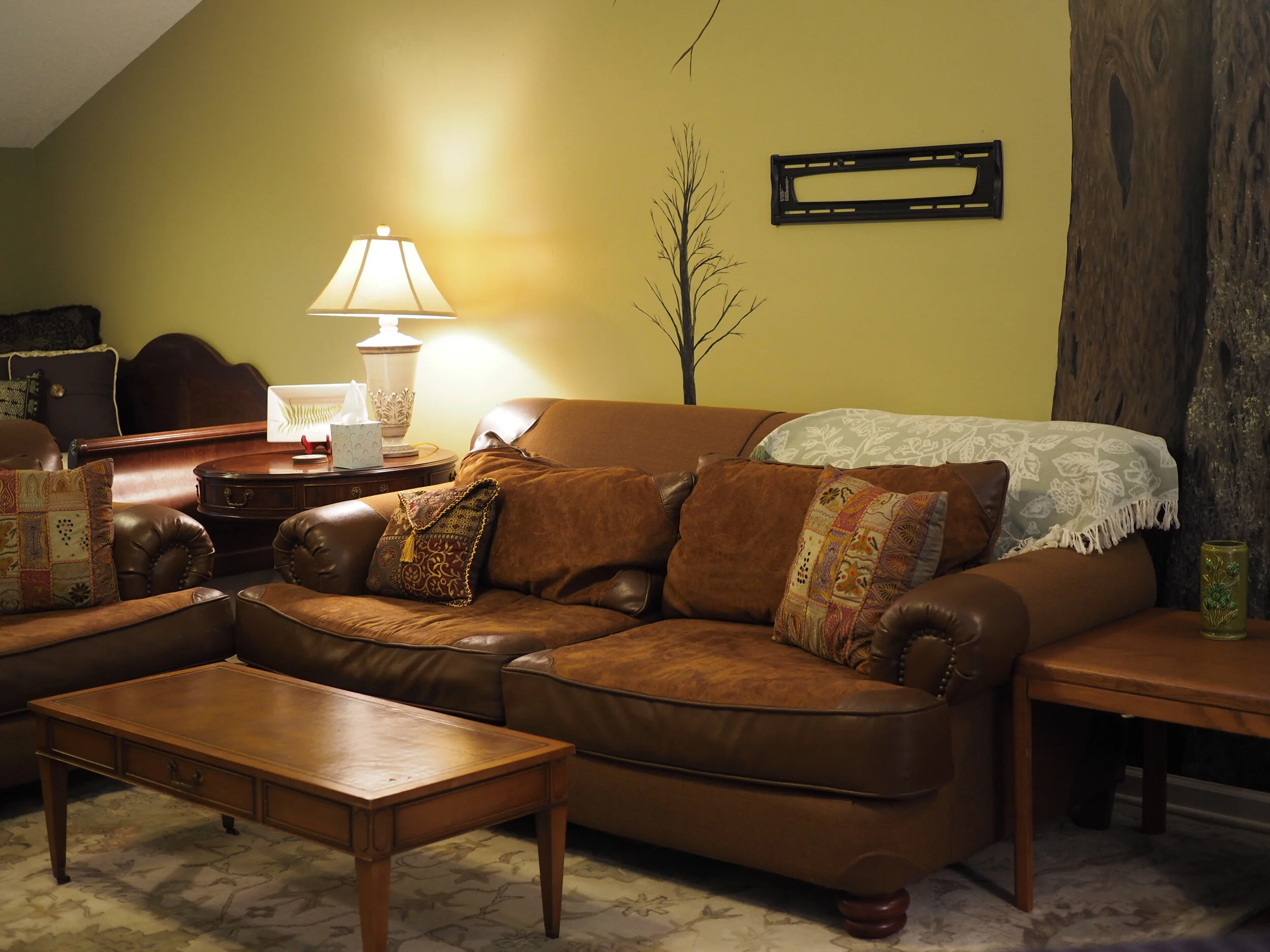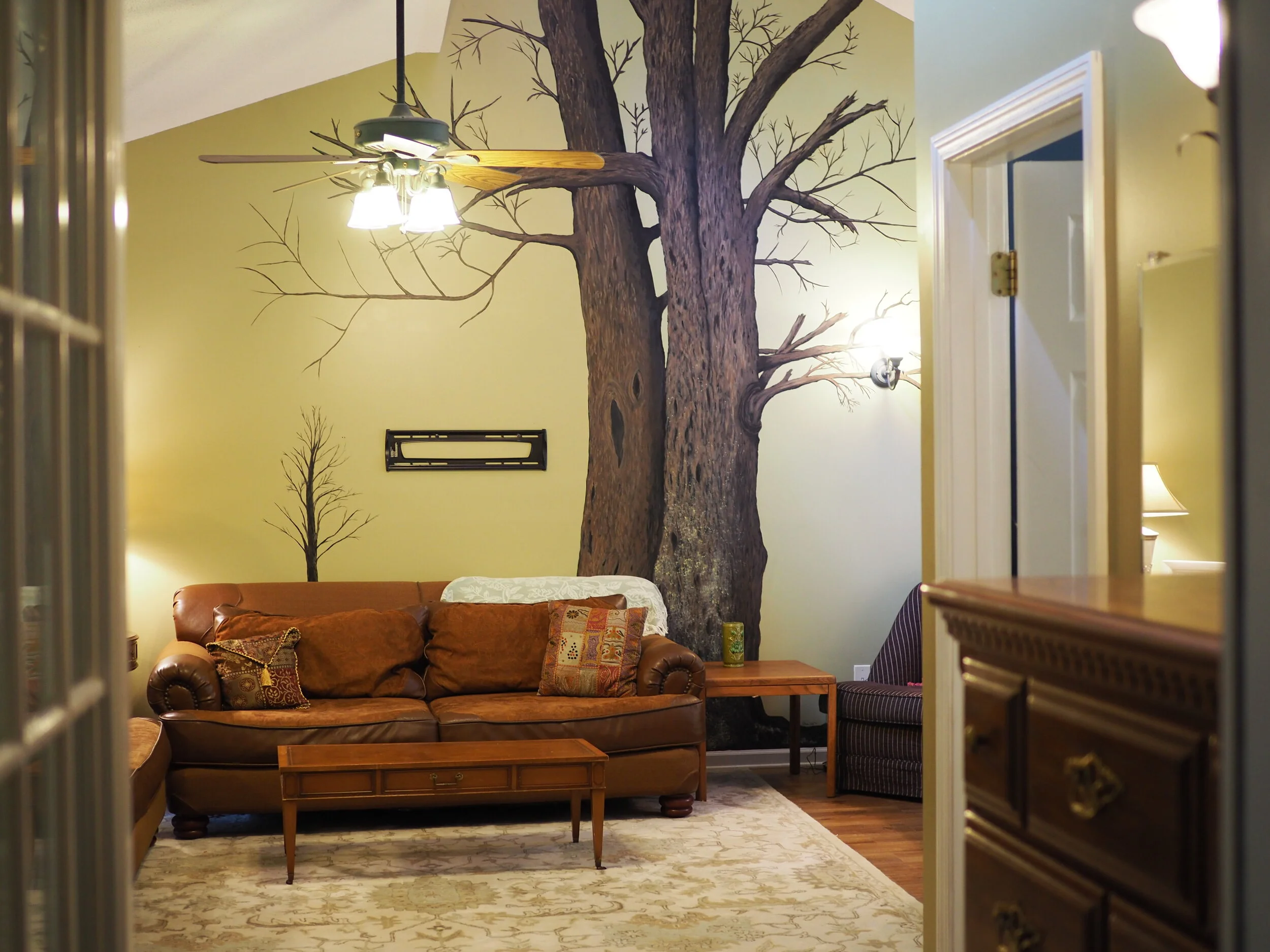 Beautiful tree mural is the defining feature of this place