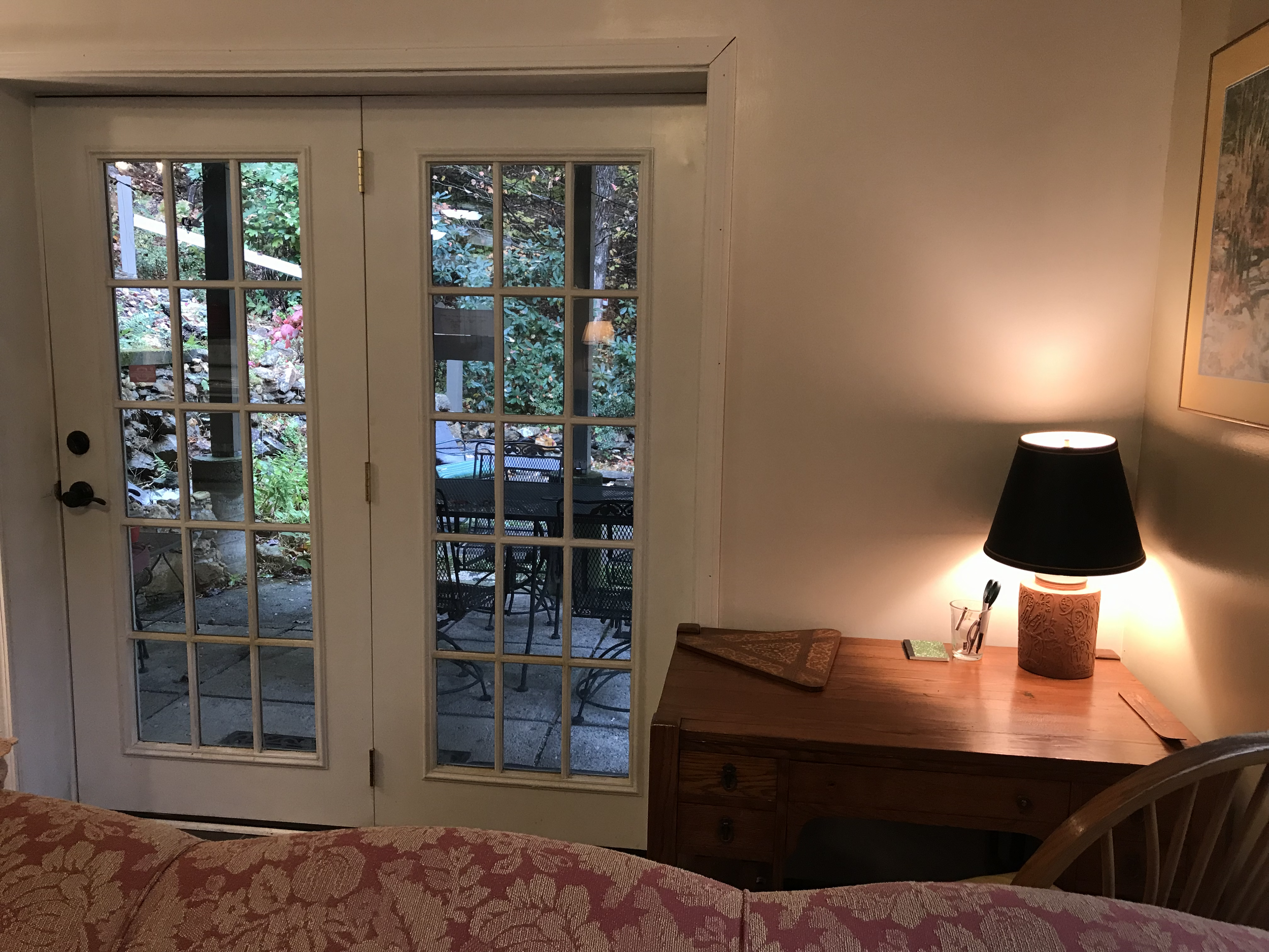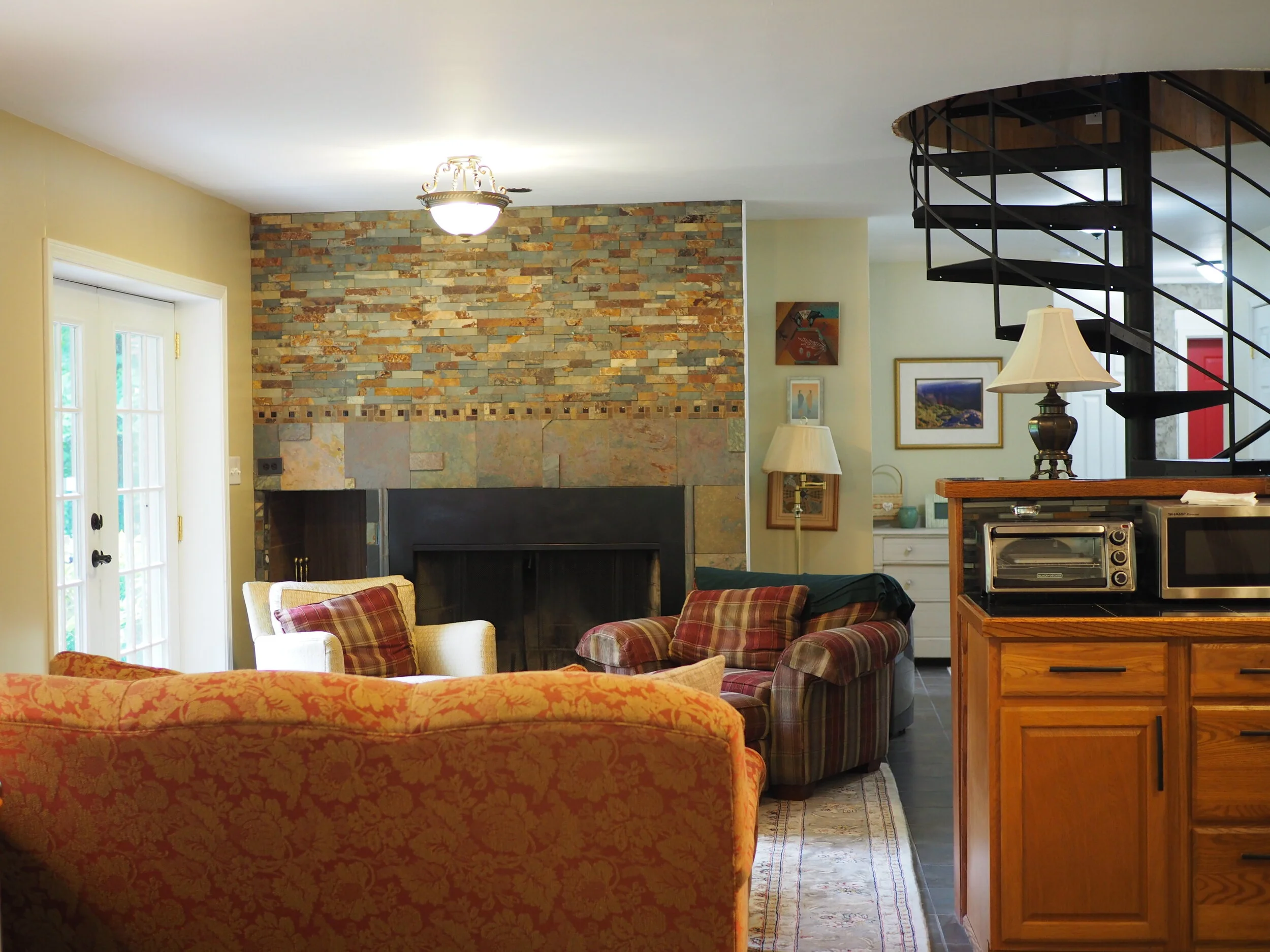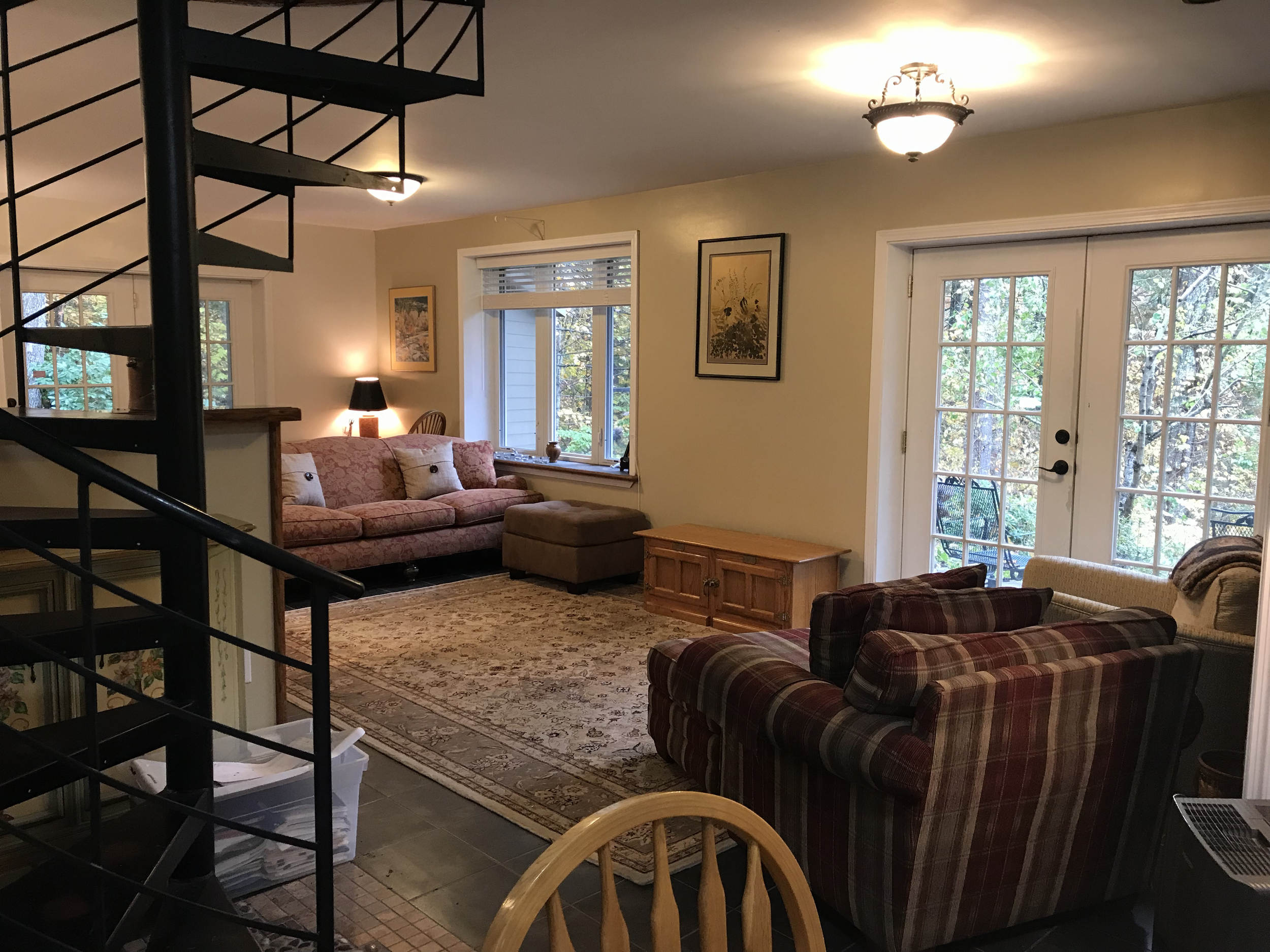 The garden cave apartment has a large open space with 2 sets of French doors. One pair takes you out to a covered slate patio and the other one to a sunny space in the garden. It has a full kitchen and a large butcher block table which seats 4. The earth toned stone fireplace is operational and cozy chairs and couch enable you to kick back and look out on verdant surroundings. The private bedroom has large windows looking out onto the gardena and offers a great quality double bed and lots of places to store your belongings. The custom tiled bathroom has a full sized tub and shower and a lovely artisan topaz glass sink. A large walk in closet and laundry room add to the units connivence. Large folding tables are available for those with creative projects or who need multiple work spaces. Wifi and printers available for those that require it. The owner lives up the spiral staircase and composes music, paints, and has a contemplative life, guests who like quiet will appreciate this setting. View our House Guidelines for more information.